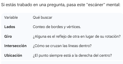 - Reflexión (Efecto Espejo): A veces una figura no está rotada, sino "volteada", lo que la hace imposible de superponer con las demás.